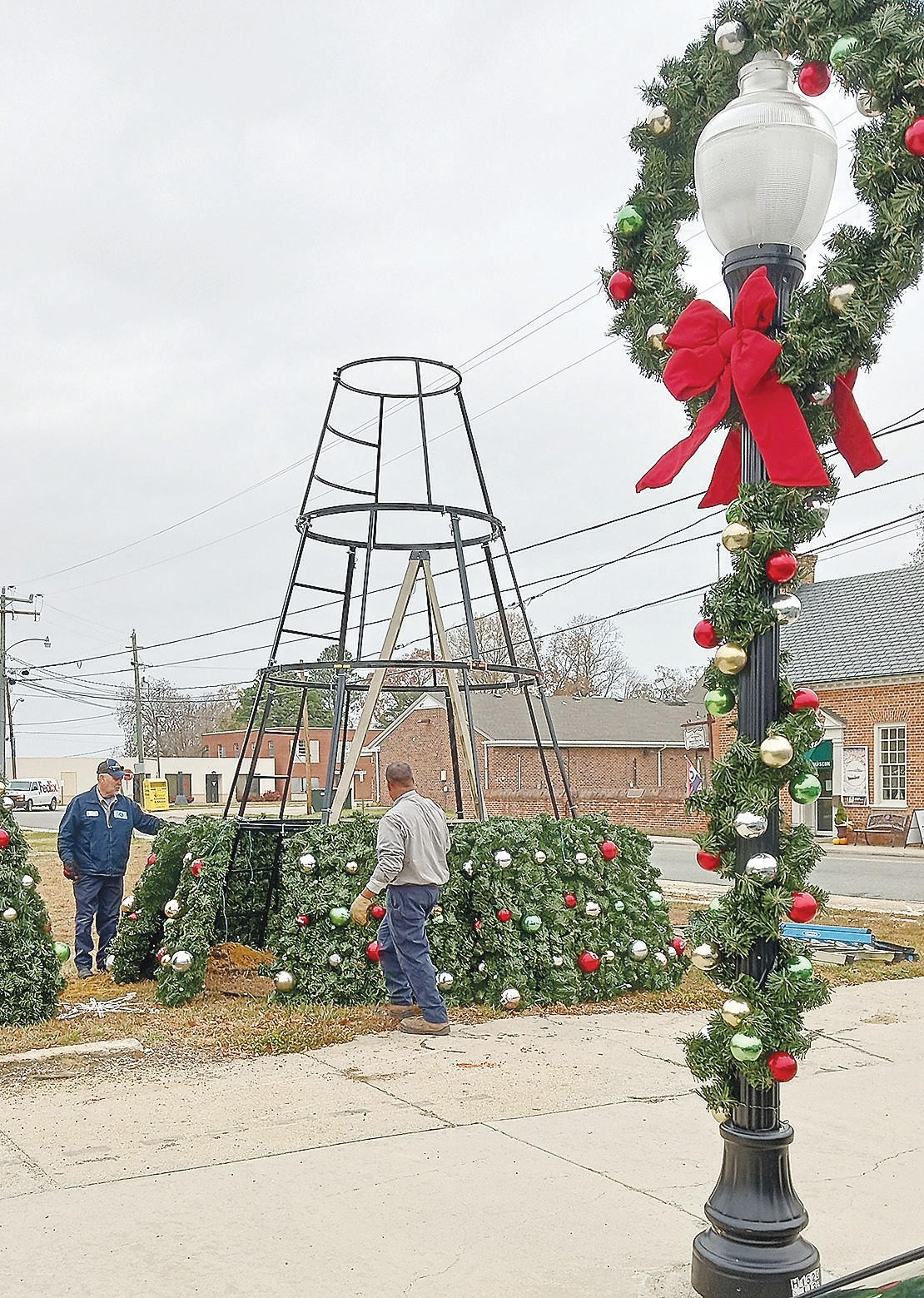 Town of Tappahannock crews were busy last week installing Christmas decorations on lamp posts along Prince Street. Workers also installed the Christmas tree on the vacant lot at Prince Street and Water Lane. The lighting of the tree will take place at the conclusion of the 50th Annual Christmas Parade that is scheduled to march off at 4:30 p.m. on Saturday, December 6.