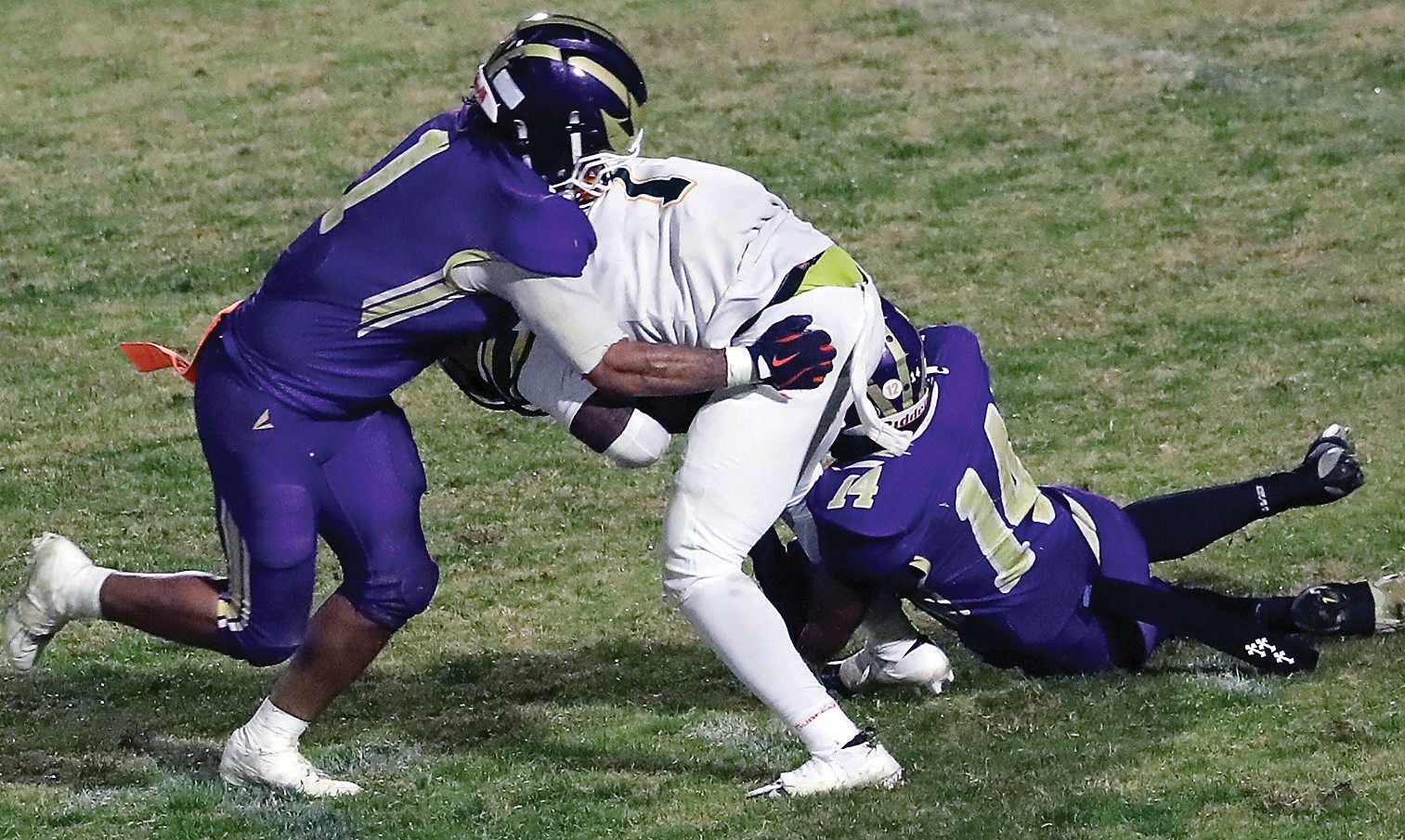 Essex’s Zay Bundy (1) and Jodece Cox combine to bring down Northumberland’s Cincere Gibson in the Indians’ backfield following a pass reception.