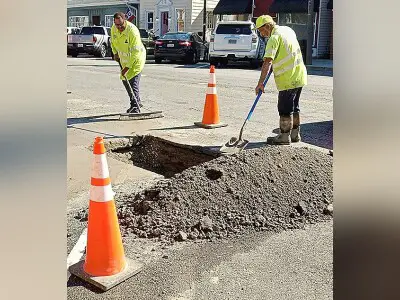 Town of Tappahanock work crews were busy the afternoon of October 15 repairing a water line leak on the east side of Prince Street. Above, Keith Bundy (left) and Tor Howard were among the workers addressing the issue.
